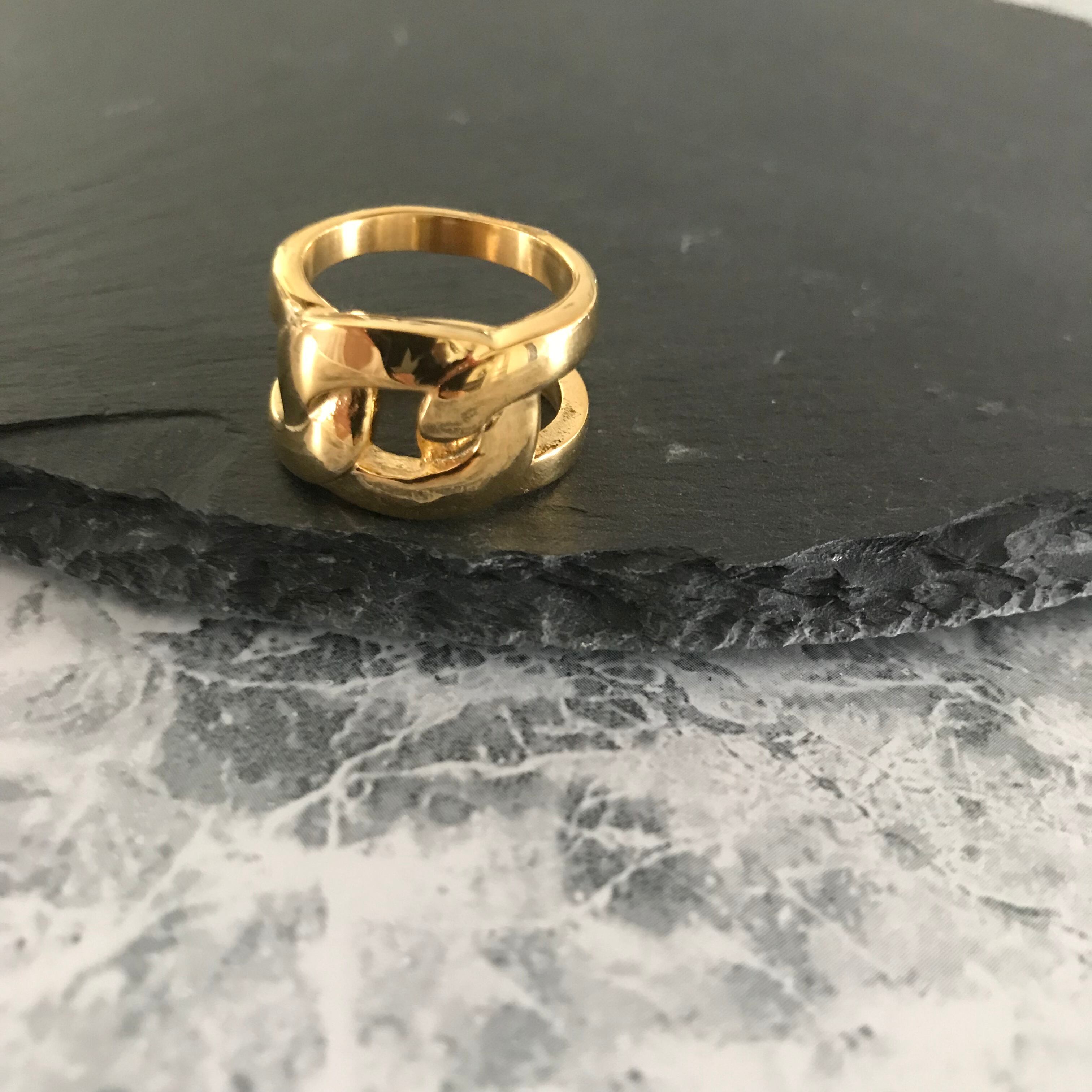 ゴールドの太いチェーンのようなデザインの指輪です。存在感もバッチリ!