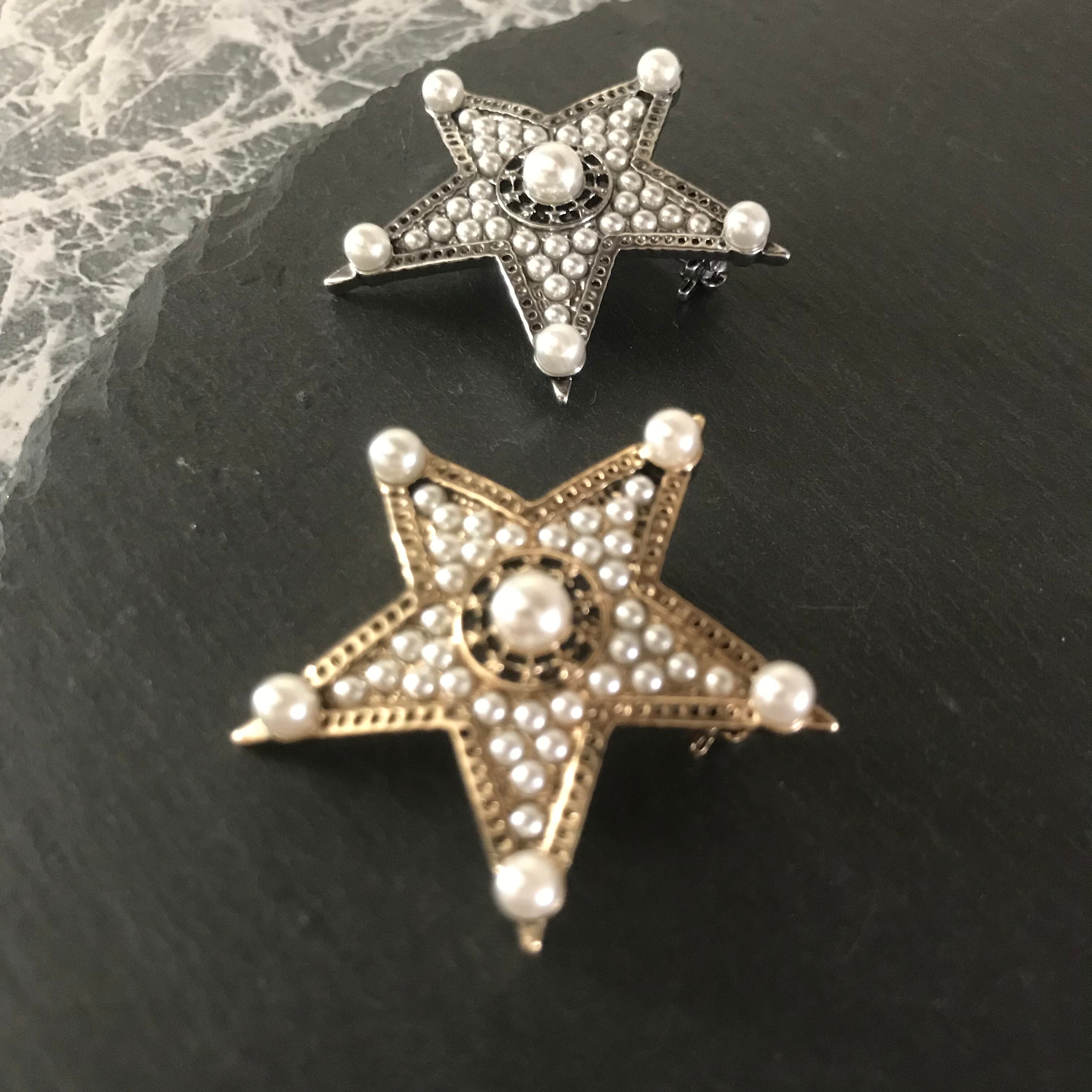 アンティークゴールド、アンティークシルバーカラーにパールの組み合わせがステキな星型ブローチです。
