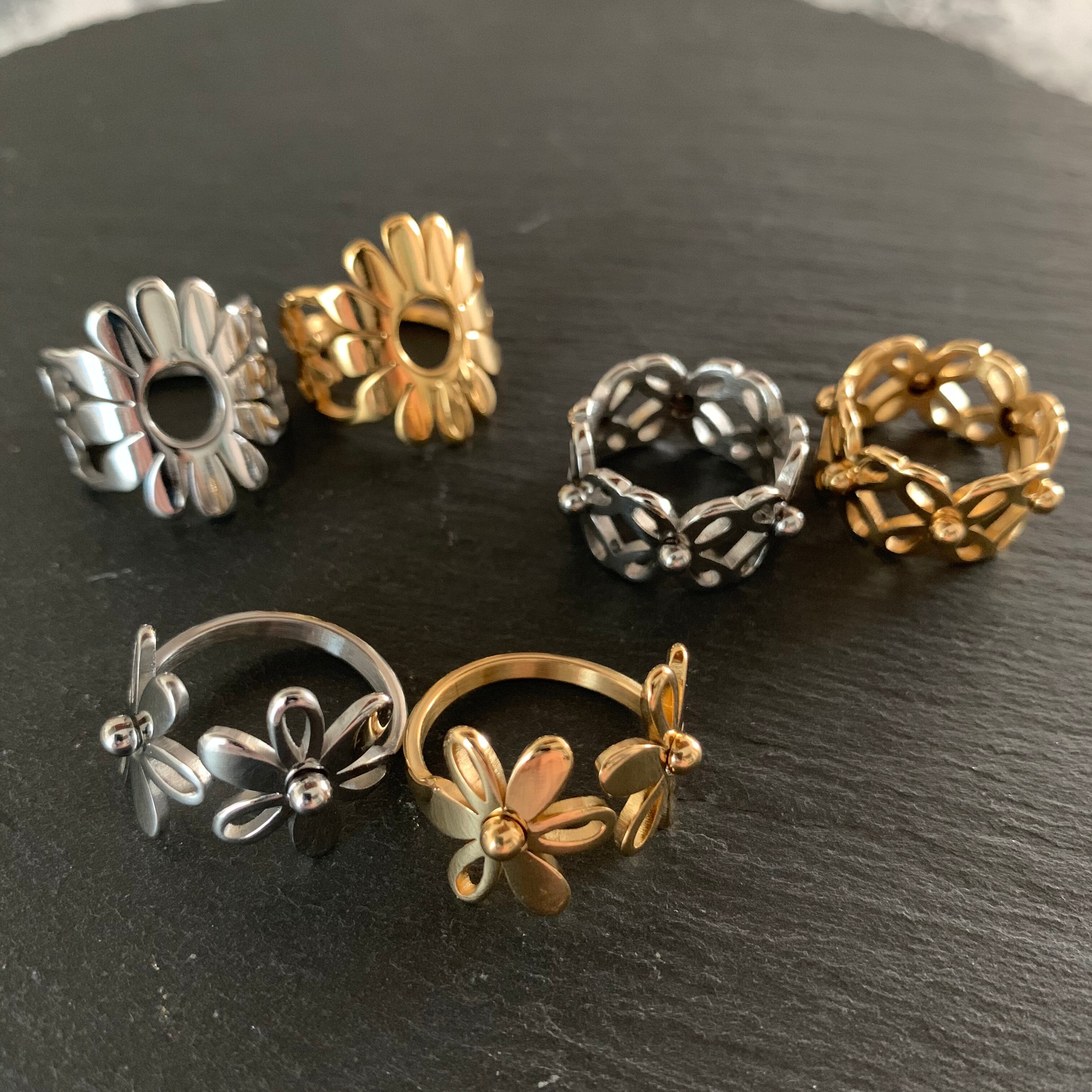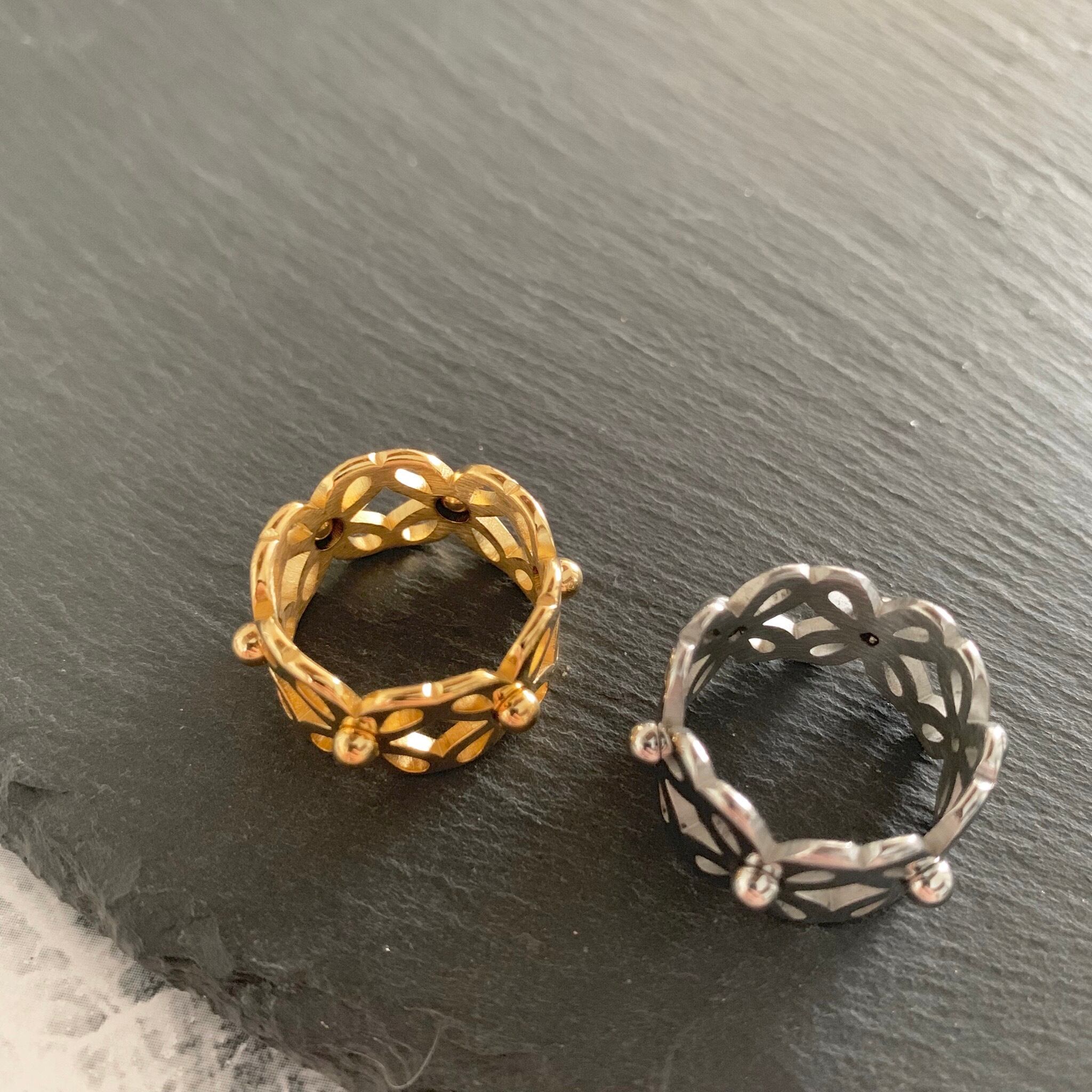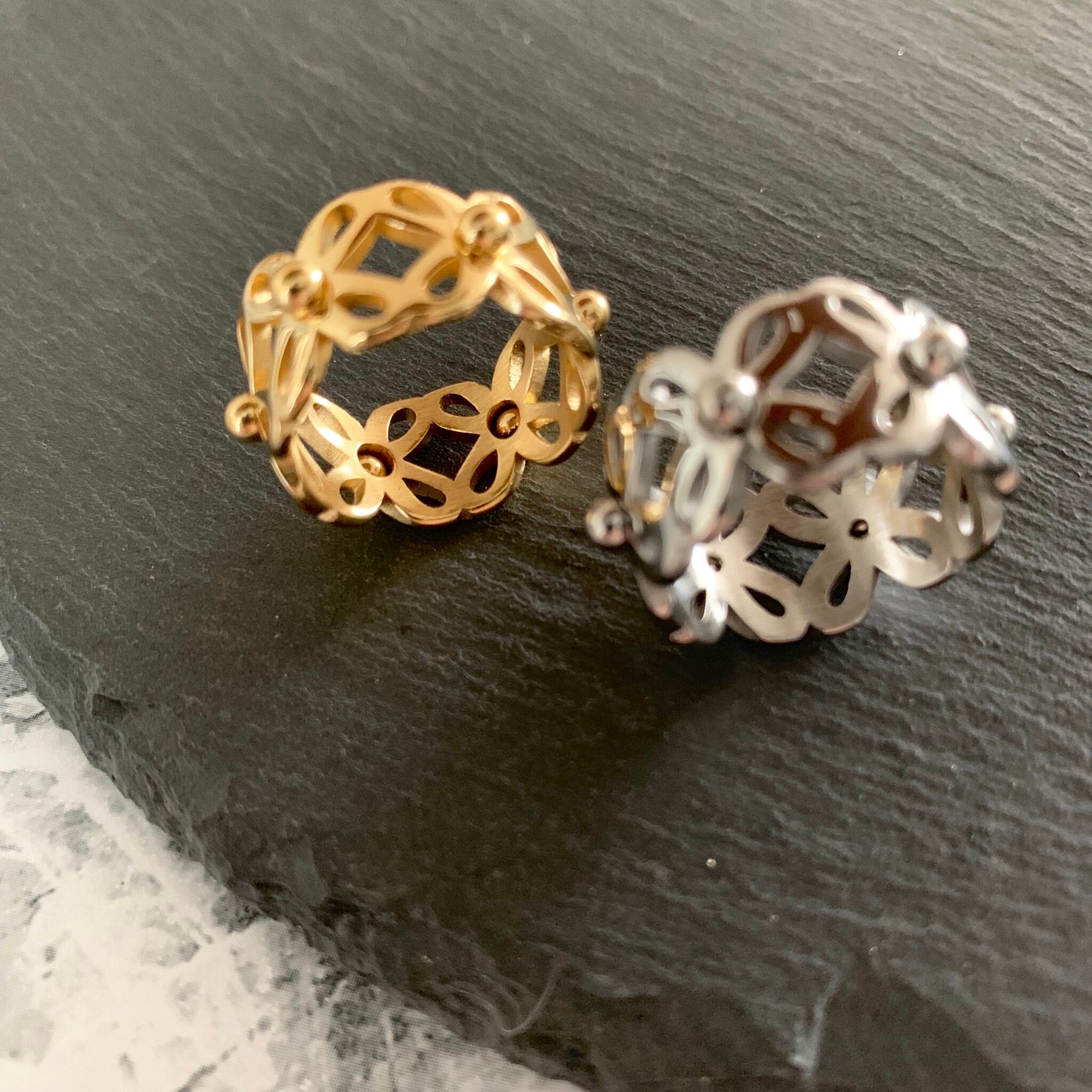 フラワーデザインがぐるりとデザインされた可愛いリングです。